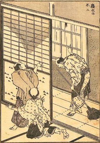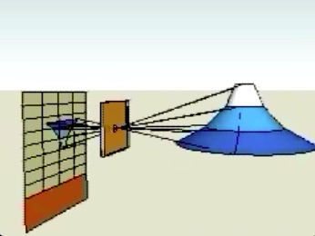 Probably it was the memory when I was a lower grade schoolchild of a primary school or much more younger. It was a morning after snowfall all through the night, when the sun was extremely dazzling. I was maybe sick in a bed because of cold, when I saw a pinhole phenomenon definitely. Light was coming from outside through a knothole of a wooden shelter (“amado” in Japanese) and the light beam in which dusts were dancing shined a paper sliding door (“shoji” in Japanese) of the room, where the scenery of the outside was projected (An old house built in Japanese style was made of wood and paper!). This is a similar scene as that of the woodcut by Hokusai Katsushika, “Sai-ana no Fuji (Mt. Fuji projected through a knothole)”. In this woodcut an image of Mt.Fuji is projected on a shoji through a knothole of an amado as seen in the figure shown later of this page.