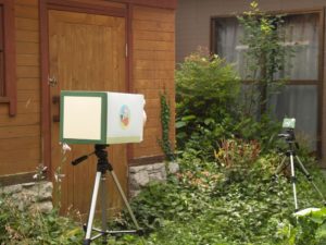 By the way Matt Young described in the article about the discovery of the pinhead mirror.  It was described that Thomy Nilsson, a vision scientist discovered the pinhead mirror in 1986 and he asked whether it was an undiscovered imaging device before 1986.  It was also described that three letters in Lasers and Optics (1982, p.12) suggested that the pinhead mirror had been invented before and an example by Donald O’Shea was mentioned.  I have not read the above letters in Lasers and Optics but I have found that Robert W. Wood, the famous US physicist whom I describe in the pages of a zone plate photography, an infrared photography, and an ultraviolet photography of this site, had already described on the pinhole mirror in his book “Physical Optics, the 3rd edition” (1934 Macmillan, Reprint: 1988 US Optics Society), p.272.  Though there is not a description on the pinhole mirror in the 1st and the 2nd edition of “Physical Optics”, it might be possible that he knew the pinhole mirror before the publication of the 3rd edition because he was interested in the lensless photography, and he took zone plate photographs and submitted a paper concerning them.  In the 3rd edition of his book he introduced the formula of the optimized pinhole diameter derived by Lord Rayleigh and described a concrete design of a pinhole mirror as follows.  At first by using a pinhole with a diameter of 15 mm we project an image of the sun on a wall located, for example, 200 ft (about 60 m) apart from a window or a door through a dark corridor.  As in this case the optimum pinhole diameter is about 6 mm the diameter of 15 mm is too large and the resolution power is degraded considerably.  However, as the light intensity at the image plane is 6 times larger than the case by the pinhole of the optimum diameter,  the sun can be observed in a rather light room.  Wood described that if a very dark corridor is available and the image plane is sufficiently dark a striking result will be attained by using a pinhole with an optimized diameter.  Moreover, it was mentioned that an elliptic pinhole might be better for the shape of the pinhole used for the pinhole mirror because as for the shape of pinhole seen from the image plane a perfect circle is better.
