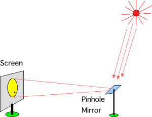 A pinhole mirror is a surface mirror on which a pinhole plate is affixed.  An incident light through the pinhole is reflected at the surface of the mirror and goes outward through the same pinhole again. Articles on observations of sunspots by a pinhole mirror are found in several websites such as the site by Barry Malpas.  A pinhole mirror is considered as the same device as the “pinhead mirror” introduced in the article “The Pinhole Camera” by Matt Young.  The pinhead mirror is a very small mirror which works as a pinhole, because the small mirror itself can be considered as a pinhole.  It should be remarked that there is no body tube in the “pinhole mirror telescope” unlike the pinhole telescope.  This means the image screen is exposed to the luminosity of the surroundings and, therefore, the pinhole mirror telescope can be used only for the observation of an extremely bright object such as the sun.