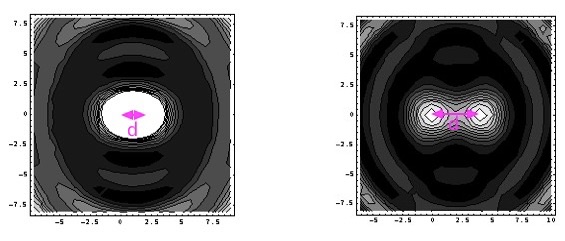 The left sub-figure: Images of two point sources placed aloof by \(d(<b)\) are not distinguishable. The right sub-figure: Images of two point sources placed aloof by \(d (>b)\) are distinguishable.