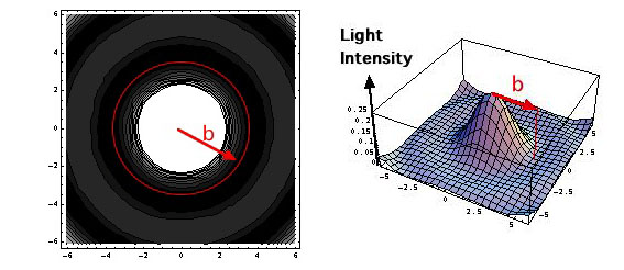 The left sub-figure shows a contour map of an image of a point source on the focal plane (image screen).  The image becomes a circle with a radius \(b\) and concentric zones of weak light intensity are seen around the circle.  The right sub-figure shows a 3D schematic figure of the light intensity distribution for the same case.