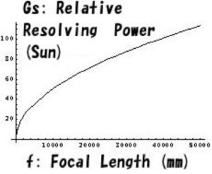 Relative resolving power versus focal length for a fixed viewing angle (the Sun)