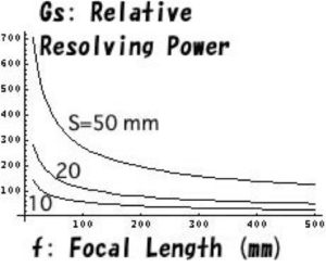 When one would take a photograph of sunspots so that the image of the sun fills up the whole imaging screen, relation between the length of a side \(S\) of an imaging screen (a sensor) and the resolving power \(b\) becomes important and we define the relative resolving power \(G(=S/b)\).  This relative resolving power is rewritten as a function of a wavelength of the light \(\lambda\), the focal length \(f\), and the size of the sensor \(S\), and it is expressed as $$G \cong \frac{1.28S}{\sqrt{\lambda f}}$$ Though in the case of a photograph or a computer display the resolving power is usually expressed as “a number of pixels per unit length”, the relative resolving power defined here is “a number of pixels per a side of a square sensor”.  As astronomical objects such as the sun are located at infinity a size of an object is expressed not by a length but by an angle viewing the object.  As the relation between the viewing angle \(\theta\) and the size of the object is expressed as \(S=\theta f\),  the relative resolving power is derived as $$G \cong 1.28 \theta \sqrt{\frac{f}{\lambda}}$$  This means that the relative resolving power is increased by increasing the focal length and the magnification factor.  If the apparent diameter of the sun, about 32’(=0.00931 radian), as adopted as the viewing angle, the relative resolving power for the sun is $$G_{sun}\cong 0.51 \sqrt{f}$$ where the unit of \(f\) is millimeter.  It should be noted that the equation is derived for the case of constant viewing angle \(\theta\).  Therefore, the size of the imaging screen becomes larger with increasing focal length.  When one takes a photograph by loading the “pinhole lens” to a ready-made camera, such as a SLR, the formula of the relative resolving power should be a function of \(S\), \(f\) and \(\lambda\) as $$G \cong \frac{1.28S}{\sqrt{\lambda f}}$$.   This equation means that the relative resolving power is improved by increasing the focal length \(f\) to increase the multiplication factor.  As the apparent diameter of the sun is about \(32’\)(=0.00931 radian), for the wavelength of \(550 nm\) this equation is reduced to  $$G_{sun}\cong 0.51 \sqrt{f} $$ It should be noted that this equation can be used for the constant value of viewing angle \(\theta\), which is the case the size of the imaging screen is increased with increasing focal length.  Therefore, for taking a photograph by using a camera with a pinhole it is necessary to use the equation $$G \cong \frac{1.28S}{\sqrt{\lambda f}}$$  It should be remarked that the resolving powers of these cases depend on \(f\) inversely.