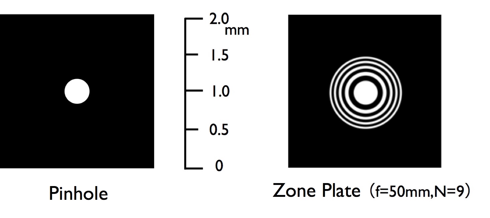A zone plate with the focal length of 50 mm and the zone number of 9 is shown in the right sub-figure. The left sub-figure shows a pinhole with the image distance of 50 mm which is the same as the focal length of the zone plate of the right sub-figure. The real size of these elements are known by the scale in the center of this figure. The diameter of the pinhole is made as the same as that of the central zone of the zone plate. In the case of this figure the diameter of the zone plate (f=50 mm, N=9) is about 1 mm, and the diameter of the corresponding pinhole is about 0.3 mm. Though there are several formulas to calculate the optimum diameter of a pinhole there is no big difference between the diameters of a pinhole and a central zone of a zone plate.