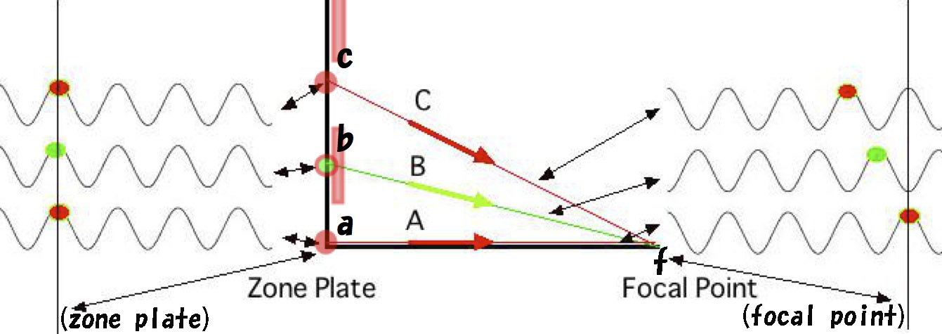 We consider light rays perpendicularly incident to a zone plate from left, among which a light ray (A) passes through the central transparent zone and proceeds to the focal point, a (virtual) light ray (B) proceeds from the point in the first opaque zone to the focal point, and a light ray (C) is the ray from the second transparent zone to the focal point. As the length of the path becomes longer in the sequence of A, B, and C, the arrival time of the rays delays in this order. As the (virtual) light ray B delays by a half wavelength at the focal point it weaken the light ray A (destructive interference). On the other hand, as the ray C delays by one wavelength it enhances the light ray A (constructive interference). Destructive interference is avoided by cutting light rays such as B at opaque zones.
