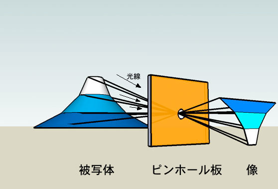被写体から出た光はまっすぐに進んでピンホールを通過して感光面に被写体と相似形の倒立した画像を描き出します。