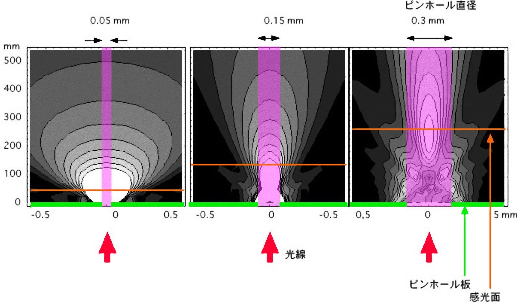鮮明な画像を得るためには、ピンホール直径は小さい程よいのではなく、焦点距離(ピンホールから感光面までの距離)に応じて最適の大きさがあります。ピンホールの直径の大きさの違いによって、ピンホールを通り抜けた光の広がり方がどのように違うかを計算した図です。ピンホールの大きさが小さいと光は急速に広がってしまい直進しないことがわかります。ピンクの領域は、光が直進するとした時に光がある領域ですが、ピンホールの直径が小さい時にはピンクの領域のかなり外側まで明るくなることがわかります。詳しい説明は「ピンホール写真の撮影ーピンホールの設計、注釈4、注釈5」にあります。