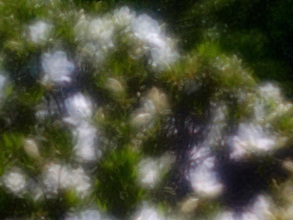 これらの写真を撮影した時に、次のような事がわかりました。まず、被写体に当たっている光が強い事が必要です。これは他のゾーンプレートの撮影でも経験した事ですが、目的とする被写体と背景の明るさの違いが大きいほど明瞭な写真が撮影可能です。この撮影の際に使ったフォトンシーブとこれらに対応するゾーンプレートとについてコンピュータシミュレーションで点光源の像の大きさ(ボケ、分解能の程度)を計算したところ、その違いはそれほど大きなものではありませんでした。ところが、実際に写真を撮ってみるとフォトンシーブによる写真はゾーンプレートによる写真と比べてかなりぼけた写真になってしまいました。このように、実際の撮影結果とは理論的な予測とは、今のところ、矛盾するように思われますが、その理由はよくわかりません。一つ考えられることは、フォトンシーブ作成に使ったミニコピーフィルムの解像度が最良で0.006 – 0.008 mm 程度であるのに対して最小ピンホールの半径が0.03 mm程度であるために外縁部のピンホールが良く効いていないか、あるいは、逆に悪い影響を与えているためではないかと想像されます。