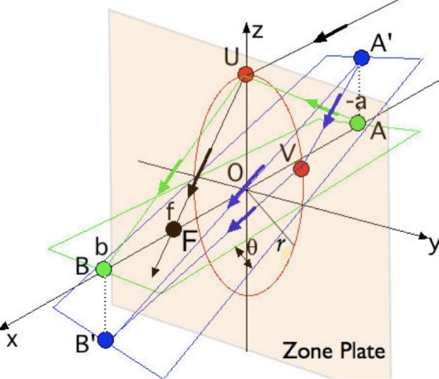 ゾーンプレートは、\(x=0\) となるyz平面上に置いてあって、光軸はx軸と一致しています。ゾーンプレート上の半径 r の円が赤い円で表してあります。無限遠の点光源からの光線の一本がUを通って焦点Fに向かいます。光軸上有限の距離にある光源からの光線の経路の一本はAUB、光軸上にない光源A‘からの光線の経路は、例えば、A’VB‘(Vはn番目のゾーン上の任意の点)となります。Aから出てBに集まる光が同位相の場合、A’から出てB’に集まる光も同位相になります。
