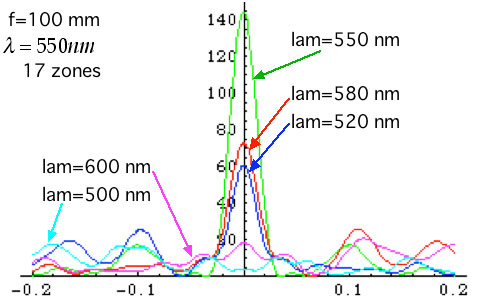 波長550 nm用のゾーンプレート(f=100 mm, 17 zones)による波長500 ~ 600 nm の光の像の広がりかた。lamは入射光の波長です。