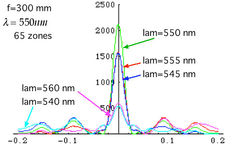 波長550 nm用のゾーンプレート(f=300 mm, 65 zones)による波長 540 ~ 560 nm の光の像の広がりかた。
