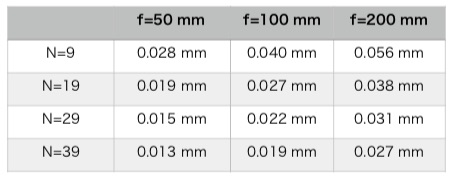 一方、これらのゾーンプレート・パターンを写し取るフィルムの候補いくつかについての分解 能をまとめたものが表2です。デジタル・カメラの時代になってフィルムがあまり使われなくなっ たため生産中止になるフィルムもふえてきましたが、ゾーンプレート・パターンを作成できる市販 フィルムはまだ存在しています。実際、表1と表2を見る限り、分解能に関しては、これらのフィ ルムはいずれも、今考えているゾーンプレート・パターンを作成する上で問題ないと考えられます。 しかし、分解能のデータは最適条件のもとでのデータであることを考えれば、上の表のFujicolor 100とVelvia 50は焦点距離50 mmでゾーン数29以上のゾーンプレート・パターンを製作する上 で十分余裕があるとは言えないかもしれません。
