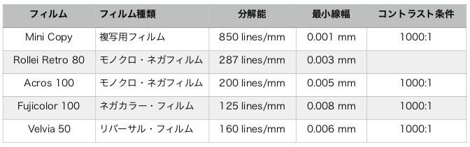 表2 各種フィルムの分解能の例