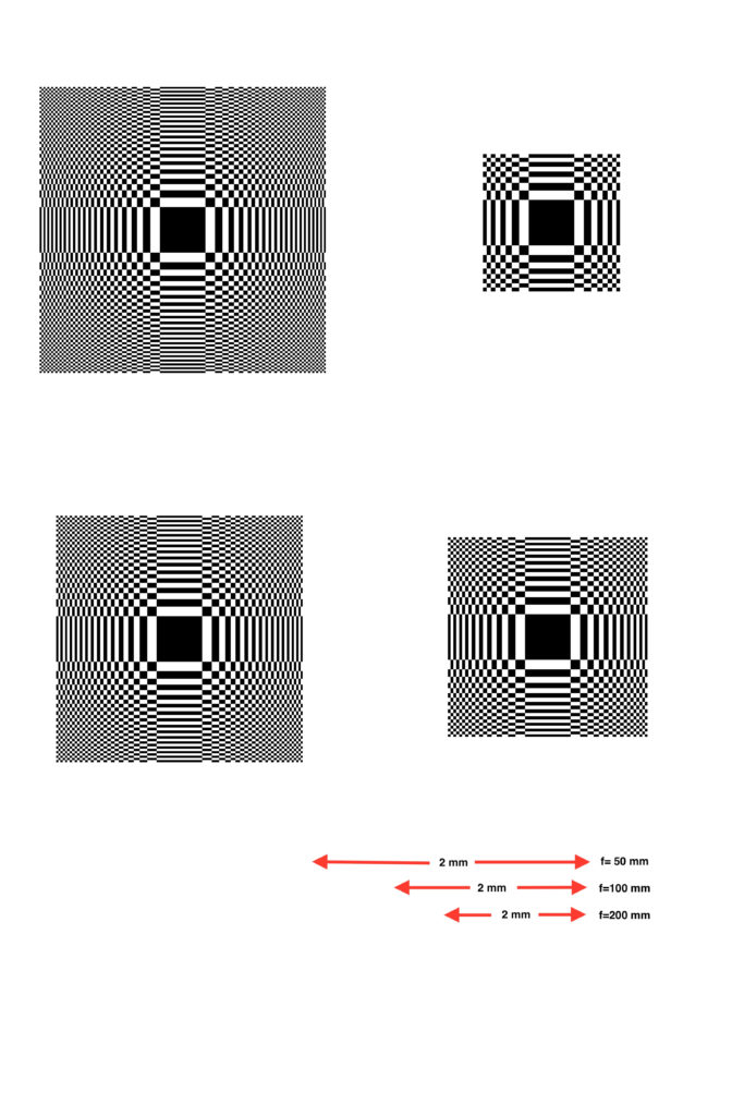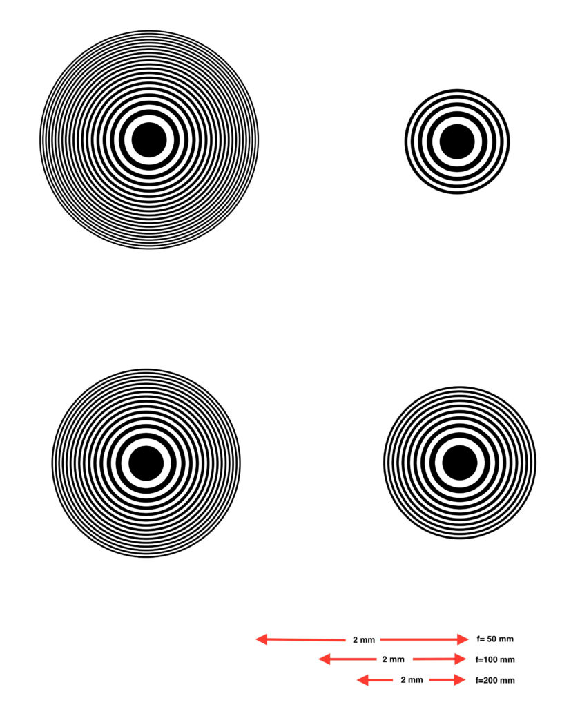 ゾーン数9、19、29、39(小さいほうから順に、右上から時計回り)のフレネル・ゾーン プレートのパターン拡大図を示す。赤い矢印は、上から順に、焦点距離が 50 mm、100 mm、200 mmのときのフィルム上の長さを示す。