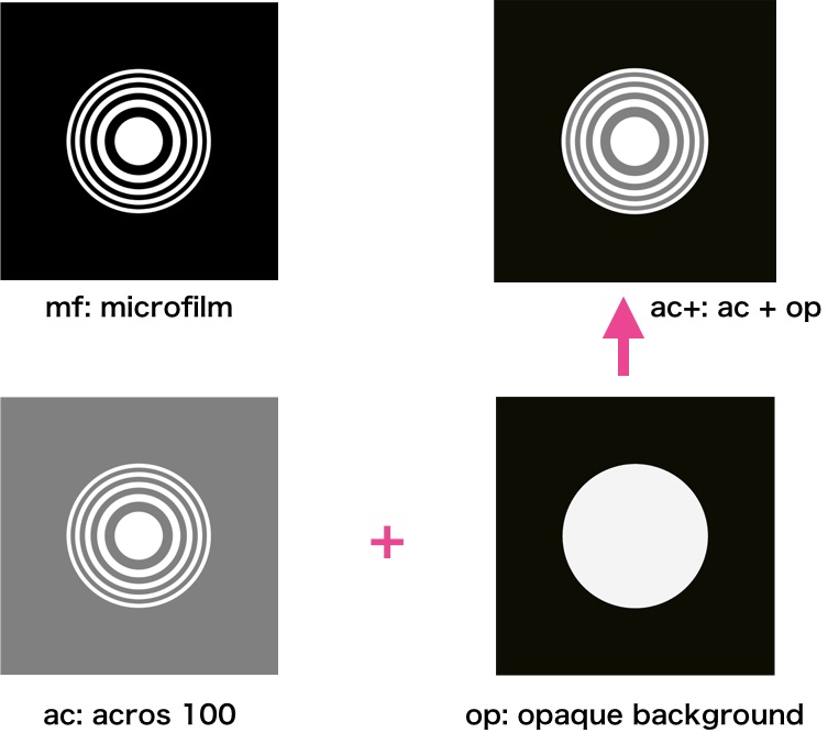 モノクロ・ネガフィルム (acros 100)で作成したゾーンプレートの性能を比較するために、マイ クロフィルム(mf)、acros 100(ac)によるゾーンプレートに加えて、ac-ゾーンプレートの背景の不 透明度を高めた「ac+」ゾーンプレートによる撮影も行いました。マイクロフィルムによるゾーン プレートmfを基準に見ると、ゾーンプレートacは全体的に不透明度が低くグレイにみえ、補正した ゾーンプレートac+はゾーンプレートの部分だけが不透明度が低くグレイに見えます。