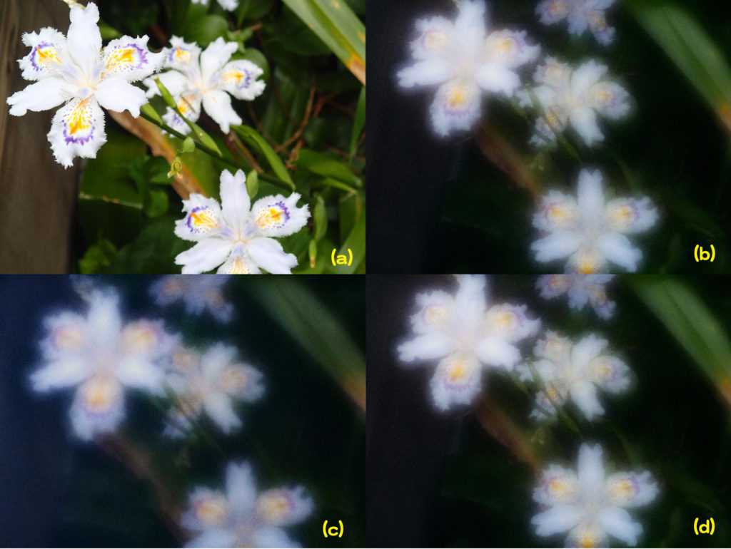 焦点距離 50 mm、ゾーン数 9 のフレネル・ゾーンプレートで撮影したシャガの花(霞取り処理後 の写真)。(a) レンズ付きカメラで撮ったシャガの花、(b)マイクロフィルムで作ったゾーンプレー トによるシャガの花、 (c) acros 100 で作ったゾーンプレートによるシャガの花、(d) acros 100 で作っ たゾーンプレートの外部の不透明度を上げたゾーンプレートによるシャガの花。