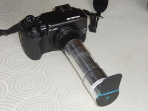 背景光除去法として画面全体から一定の「明るさ」を取り除くことを既に書きましたが、背景光がピンホールによる像であることがわかったので、この像による光量を引き去ることができればより厳密に背景光を取り除くことができます。このためには、ゾーンプレートのパターンと同じ大きさのピンホールを作り、このピンホールを用いて撮影した画像をゾーンプレートにおける背景光と見なして用いれば良い訳です。ピンホール写真とゾーンプレート写真を合計2枚撮影して重ね合わせる訳ですから、これらの写真は全く同じ位置で、しかも時間的にもできるだけ近く撮影する必要があります。そこで、ピンホール撮影用の装置にゾーンプレート・パターンのついたプレートを付けてゾーンプレート写真を撮影し、直ちにそのプレートを引き抜いてピンホール写真の撮影ができるような装置を作りました(図1)。最初、図1(a) のようなゾーンプレートをピンホールの前に挿入して(図1(b) )ゾーンプレート写真の撮影を行い、直ちにこのゾーンプレートを引き抜いて大きな半径のピンホールにして、これで背景光の撮影を行います。