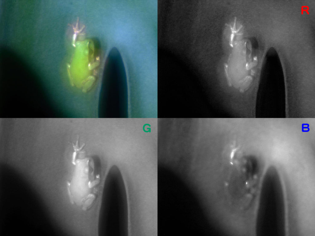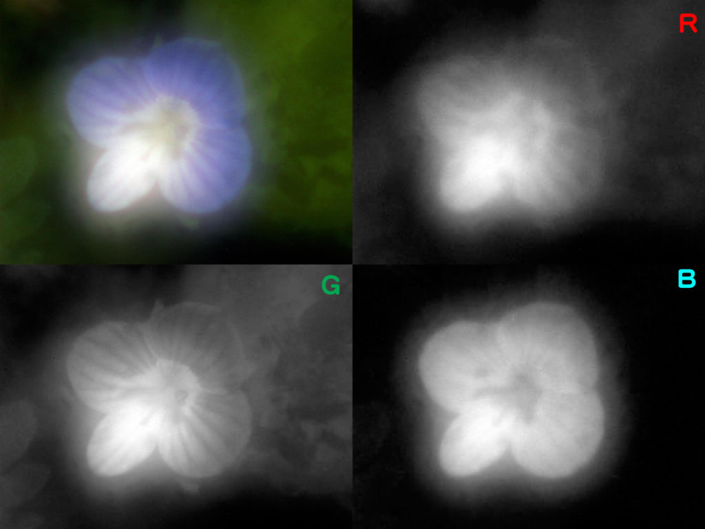 左上の図はRGB分解前のゾーンプレート写真。R、G、Bの表記のある図は、それぞれ、Rチャンネル、Gチャンネル、Bチャンネルに分解した画像を表しています。全体的に見てGチャンネルの画像が最もシャープですがBチャンネルの画像もこれに劣らずシャープです。ほぼ等倍のマクロ写真です。カメラ:Olympus E-300, ISO 320, 1/160 sec