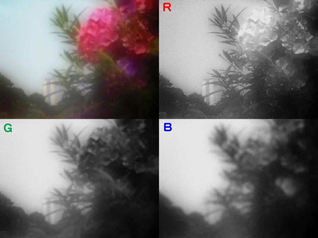 実際の写真でこの色収差の効果がどのように見えるかは被写体や撮影条件によって色々で、多くの場合、見た目にはほとんど色収差を感じられない写真が撮れます。しかし、このような場合にも、写真をRGBチャンネルに分解してみると、実際に焦点が合っているのは設計波長550 nmを中心に含むG(緑)チャンネルであることがわかります。実際的なゾーンプレートでは、400 nmから700 nmまでの可視光全域の光に対して同時に焦点を合わせることが出来ませんからR(赤)チャンネルとB(青)チャンネルの像はぼけてしまいます。しかし、Gチャンネルの像が形をはっきりと表現していれば、多くの場合、色はRGBを混ぜ合わせて自然な画像を作り出すことが可能であるようです。しかし、被写体からの光線としては必ずしも波長550 nmの光線が最も強い訳ではありませんから、Gチャンネルの光が他のチャンネルに比べて弱い場合には固定焦点では本質的に不鮮明な写真になってしまうことはやむを得ません。このため、ゾーンプレート写真は被写体の状況によって大幅に出来上がりが異なってしまいます。被写体として得意な分野があるのです。このような効果を減らすために撮影に当たっては像距離を調整する必要があります。このため、ゾーンプレートはF値が大きくて、普通なら、パンフォーカスと考えられるのに撮影に当たってピント合わせが必要なのです。