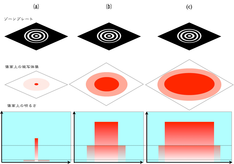 左から右に行くにつれて被写体像の大きさが大きくなります。被写体像の大きさがゾーンプレートの大きさ程度になるまではハローの明るさは増加しますがそれ以後は被写体がいくら大きくなってもほぼ同じ明るさになります。この「被写体」周辺の背景の像の「ハロー」(背景光)は写真全体をぼんやりさせる「かすみ」になります。