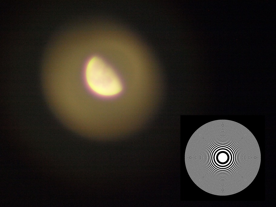 焦点距離300 mm、ゾーン数65のゾーンプレートで撮影した月の写真です。センサー面上でのゾーンプレートの大きさを右下に示してあります。ハローの幅はほぼ最外ゾーンの半径に等しいことがわかります。中心ゾーンの円の大きさよりも小さな構造まで撮影できることがわかります。