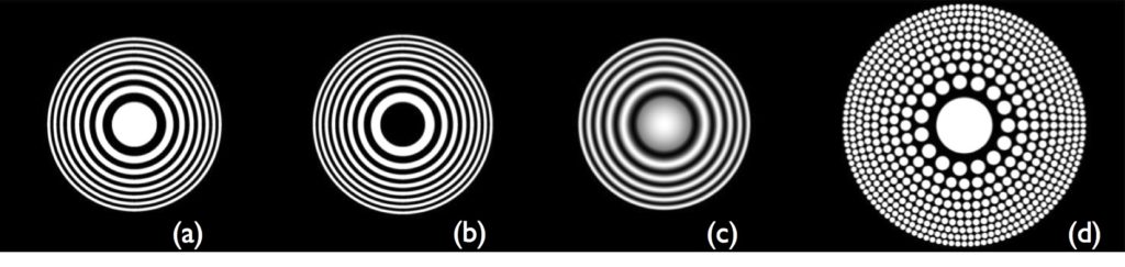 (a, b) フレネル・ゾーンプレート(Fresnel Zone Plate):白(透明ゾーン)と黒(不透明部分)の2階調で作られています。(a) は中心が透明な「正のゾーンプレート」、(b) は中心の円が不透明な「負のゾーンプレート」です。(c) ガボール・ゾーンプレート(Gabor Zone Plate):透明度が連続的に変化しています。(d) フォトン・シーブ(Photon Sieve):透明ゾーンの代わりに多数の穴があいています。