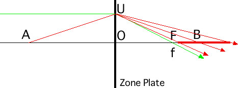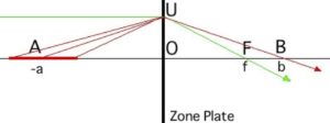 だけはなれた点、即ち、\(f-\Delta f\)および \(f+\Delta f\) のところで、N番目のゾーンからの回折光の寄与が無くなります。したがって、このゾーン数 N のゾーンプレートは \(f(1-1/N)\) から \(f(1+1/N)\) の範囲内で焦点を結んでいると解釈することができます。もっとも、この限界位置での「点光源の像の半径の増加分」はピントの合った像の半径の \(1/\sqrt{2N}\) 倍程度ですからわずかなものです。後に色収差のところで述べるように、「波長の許容範囲」もこれと同様の形をしており、可視光撮影の場合、許容波長範囲を、できれば(400 – 700 nm)としたいところですのでこれは極めて厳しい条件です。焦点距離の場合、手作りのゾーンプレートであってもその位置を1 mm程度以下の精度で決めることはそれほど難しくありませんから比較的楽な条件と言うことが出来ます。また、これは、無限遠にある点光源に対する焦点深度ですが、有限の距離にある光源に対する像についての焦点深度も同様に計算できて、像の位置を \(b\)としてピントの合う範囲は、