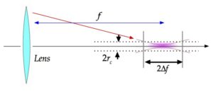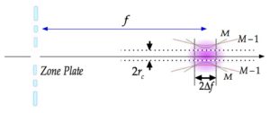 無限遠の点光源に対する焦点深度は焦点距離の許容範囲(\(\pm \Delta f\))です。レンズの場合、点光源の像の半径と許容錯乱円半径(\(r_c\))との比較で決まります。ゾーンプレートの場合、焦点深度は、普通は、ゾーン数Mのゾーンプレートが作る像の半径がゾーン数M−1のプレートの作る像の半径に一致する位置で決まるように定義することにします。