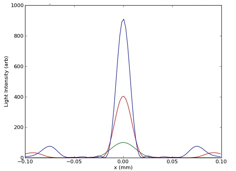焦点距離 \(f=50 mm\)のゾーンプレートによる無限遠の点光源の像。撮像面はゾーンプレートから50 mm の位置にある。緑、赤、青の曲線はゾーン数が9、19、29の像を示しています。