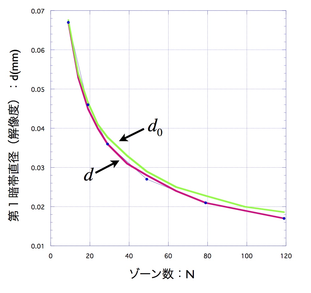 解像度(第一暗帯の中心円の直径)のゾーン数依存性の計算値(青丸)とこれにフィットさせた曲線(赤の実線)を表しています。