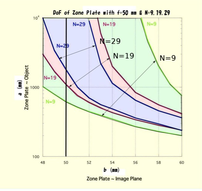 上の仮説が正しいかどうかを検討する為に、ゾーンプレートから撮像面までの距離が目標値からずれていた場合に被写界深度がどれほど浅くなるかについて計算した結果が下の被写界深度の図です(図3)。この図は焦点距離50 mmのフレネル・ゾーンプレートについての計算結果をまとめたものです。横軸は撮像面の位置、縦軸は被写体の位置を示してあります。緑、赤、青の曲線の内側は、それぞれ、ゾーン数9、19、29のゾーンプレートによってピントが合う領域を示してあります。なお、ここで示した領域の境界は、\(a\)(ゾーンプレートから被写体までの距離)を固定したときに光量が最大になる点(結像の公式を使って撮像面の位置 \(a\)と焦点距離 \(f\) から決まる点)の光量の半分になる \(b\)(ゾーンプレートから撮像面までの距離)を求めて決めてあります(注意:解像度の議論をした所では、光の強さが半分になるところではなく0になるところを使っています)。もし、撮像面を焦点面と同じ位置(50mm)に置けば、当然、無限遠にある被写体にピントが合いますが、例えばゾーン数が 9 のゾーンプレートでは被写体がほぼ500 mm よりも遠くにあればどこにあってもピントが合うことがわかります。これに対して、撮像面をゾーンプレートから58 mm の位置に置くと(\(b=58 mm\))、ほぼ 200 mm ~ 2000 mm の範囲にしかピントが合いません。また、ゾーン数が増加するに連れてピントの合う領域が狭くなっていく事も分かります。このために、ゾーン数の多いゾーンプレートでは撮像面を置く位置をより正確に合わせる必要が出てきます。例えば、\(10 m\) 離れた位置にある被写体を撮影する場合、撮像面を50 mmの位置に置けば良いのですが、ゾーン数9の場合この位置が 6 mm 程度ずれていても(すなわち、\(b=56 mm\) でも)撮影可能なのに、ゾーン数が19、29の場合には、それぞれ、\(3 mm、2 mm\) 程度以下の誤差しか許されません。このことは、撮像面の位置に誤差があるときにはゾーン数の多いゾーンプレートほど写りが悪くなる事を示しています。手作り「ゾーンプレートレンズ」では、取り付け精度がそれほど高くはないと考えられますから、この理由によってゾーン数が大きいときに画像がぼける事を説明できると考えられます。
