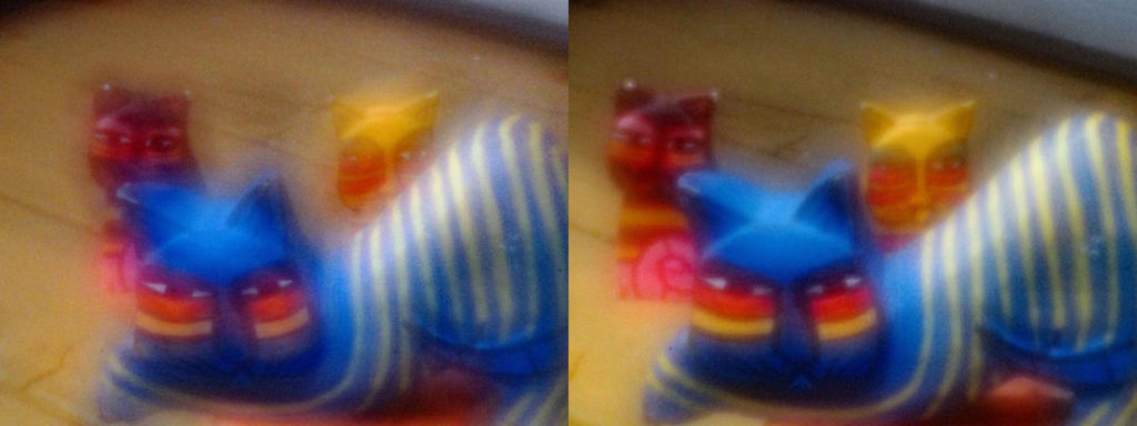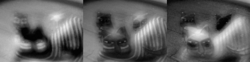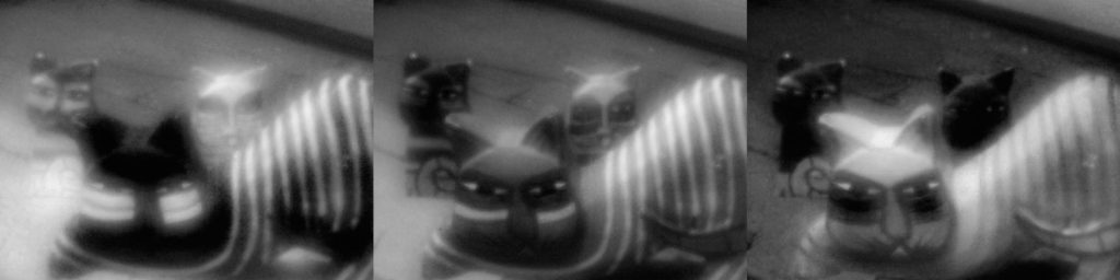 左図はフレネル・ゾーンプレート(f=50 mm, N=29)による写真、右図はフラクタル・ゾーンプレート(f=50 mm, S=3)による写真です。被写体はバリの猫の置物で小さな猫は 60 cm、大きな猫は 45 cmゾーンプレートから離れた所に置かれています。