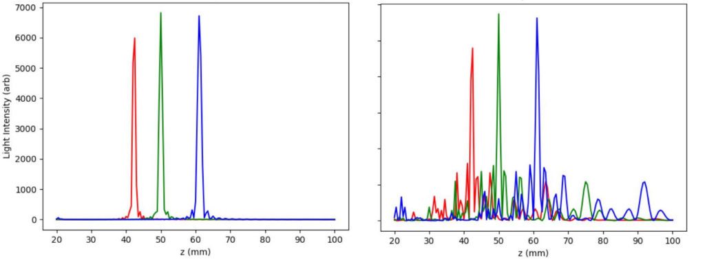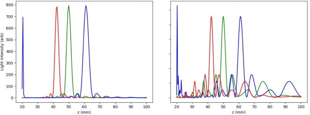 左図は波長550 nmに対して焦点距離50 mm、ゾーン数27のフレネル・ゾーンプレートで、右図は波長550 nm に対して焦点距離50 mm、S=3 のフラクタル・ゾーンプレートの場合です。また、赤、緑、青の曲線は、実際の入射光の波長が、それぞれ、450、550、650 nm の場合を表しています。