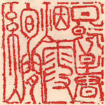 第4回「グループ翔作品展」は、20世紀も押し詰まった1999年の開催でした。というよりも、1940年生まれの私たちにとっては還暦を目前にしての展覧会です。少し前までは自分たちが60歳になったときのこと等とても想像もできませんでしたが、ついにその時が来てしまうのかという感じでした。当時、私の勤務していた大学の定年は65歳でしたから、還暦を迎えたと言っても定年まで5年あるので急に生活が変わる訳でもありませんが、自分が還暦直前だという事は、やはり、とても信じられない気持ちだったように思います。篆刻の題材はそういう気持ちが、菜根譚の中に見つけ出した句です。意味は、読み下し文から容易にわかるように、「 日はすでに暮れてなお夕映えは光りかがやく。歳は終わろうとして柑橘はかぐわしく匂う。たとえ晩年となろうとも、君子はいっそう精神をふるい立たせ、最後を美しく全うしようではないか」ということです。あの時から10年以上の年月が経過して、昨年(2010年)ついに古希をむかえてしまった身としては、10年以上も前にこの用な事を考えていたかと思って何やら気恥ずかしい気持ちがするとともに、10年経っても「精神百倍」どころか何分の一かに衰えているのではないかと心配です。